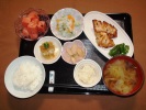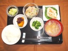 ごはん、味噌汁(豆腐、あげ、みょうが)、カラスガレイ白醤油焼き(大葉添え)、春雨中華サラダ(人参、きゅうり、ロースハム、椎茸煮、きんし玉子、かぼちゃいとこ煮、菜の花辛子和え、フルーツ:メロン(きみか) |