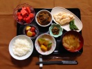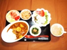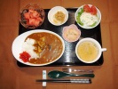 ナス・ポークカレー(ズッキーニ―、豚肉、玉ネギ、人参、揚げ茄子)、コンソメオニオンスープ、スパゲティサラダ(サニーレタス、トマト添え)、野菜玉子とじ(キャベツ、玉ネギ、人参、椎茸)、丘ひじき(おひたしおかかがけ)、フルーツ:スイカ・メロン・サクランボ |