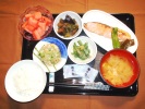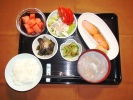 ごはん、味噌汁(大根、椎茸、あげ)、鮭塩焼き(大根おろし添え)、茄子とピーマンの炒め煮(すり胡麻がけ)、チキンサラダ(グリーンリーフ、鶏むね肉、きゅうり、トマト、胡麻ドレ)、きゅうりとなめ茸和え、フルーツ:大栄スイカ |