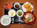 冷うどん(きゅうり、紅かまぼこ、煮あげ、かにかま、カイワレ、みょうが、柚子、万能ネギ、半熟玉子、揚げ玉)、かぼちゃのいとこ煮、菜の花の辛子和え、フルーツ:スイカ |
