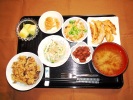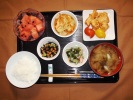きのこ釜飯風ごはん、味噌汁(玉ネギ、大粒なめこ)、揚げギョーザ、野菜玉子とじ(キャベツ、人参、椎茸、玉ネギ、グリーンピース)、もやしの酢の物(キュウリ、竹輪、すり胡麻)、豆腐なめたけ、うづら煮豆、フルーツ:アムスメロン |