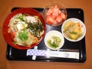 五目ちらし寿司(人参、椎茸、あげ、竹輪、たまご、いんげん、細みのり)、そうめん汁(椎茸、みょうが、紅かまぼこ、蒸し茄子)、とうがんのカニ風味あんかけ(枝豆入り)、揚げシューマイ、きゅうりパリパリ漬け、フルーツ:スイカ |