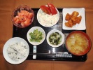 ワカメごはん、味噌汁(白菜、椎茸、みょうが)、鶏から揚げ、スパゲティサラダ(トマト添え)、キュウリとワカメの酢の物、いんげんピーナッツ和え、フルーツ:スカイ |