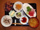 お赤飯、味噌汁(なめこ、豆腐、三つ葉)、お刺身盛り合わせ(まぐろ)、鯛の塩焼き、牛蒡・レンコン・人参の煮物、酢の物(キュウリ、ワカメ、カニカマ)、だし巻玉子、フルーツ:ぶどう(甲斐路) |