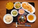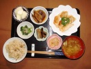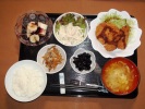 ごはん、味噌汁(豆腐、大つぶなめこ、長ネギ)、あぶらカレイ、揚げシュウマイ甘酢あんかけ(人参、椎茸、グリーンピース)、豚肉と大根煮(大根葉)、黒豆煮、はやと瓜の即席漬け、フルーツ:柿 |