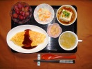 オムライス(デミグラスソースがけ)、オニオンスープ(コンソメ、パセコン)、コールスローサラダ(キャベツ、人参)、豆腐きのこのあんかけ(椎茸、しめじ、人参、万能ネギ)、白花いんげん豆、フルーツ:ぶどう(甲斐路) |