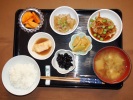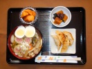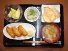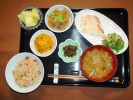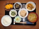 五目釜飯風ご飯、味噌汁(ワカメ、おふ、長ネギ)、かき揚げ(玉ネギ、沖あみ)、豚肉と大根煮(グリーンピース)、きゅうりとなめ茸和え、白花いんげん豆煮、フルーツ:オレンジゼリー |