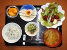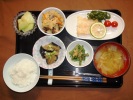 ごはん、味噌汁(白菜、あげ)、あぶらカレイのムニエル(ピーマンソティ、ミニトマト、カボス添え)、野菜玉子とじ(キャベツ、人参、玉ネギ、椎茸)、揚げ茄子と大根おろしみぞれ和え(万能ネギ)、いんげんピーナッツ和え、フルーツ:アールスメロン |