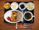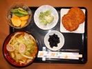 ごはん、味噌汁(玉ネギ、たまご)、チキンかつ(切干キャベツ)、スパゲティサラダ(サニーレタス添え)、金平ごぼう、黒豆煮、フルーツ:バナナ(ブルーベリーソースがけ) |