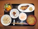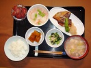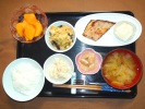 ごはん、味噌汁(白菜、椎茸)、いなだ塩こうじ焼き(大根おろし、甘酢しょうが)、野菜たまごとじ(キャベツ、人参、玉ネギ、しいたけ、たまご)、カリフラワーの胡麻ドレ和え、白花いんげん煮豆、フルーツ:柿 |