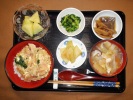 ごはん、味噌汁(白菜、あげ)、からすカレイ治部煮(ごぼう添え)、揚げ出し豆腐(大根おろし、なめ茸和え)、茄子とピーマンの炒め煮(すり胡麻がけ)、小松菜胡麻和え、大根漬物、フルーツ:柿 |