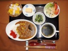 茄子ポークカレー(豚肉、玉ネギ、人参、ジャガイモ、揚げ茄子)、コンソメスープ(ワカメ、コーン)、コールスローサラダ(キャベツ、人参、キュウリ)、厚焼き玉子、黒豆煮、フルーツ:柿 |