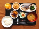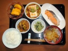ごはん、味噌汁(カブ、カブ葉、あげ)、鮭の塩焼き、豆腐きのこあんかけ(人参、オクラ、椎茸、えのき、しめじ)、麻婆茄子(豚ひき肉)、小松菜胡麻和え、フルーツ:柿 |