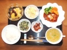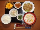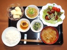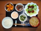 ごはん、味噌汁(白菜、椎茸、あげ)、中華ミートボール(グリンリーフ、かいわれ大根)、芋がらの煮物(人参、あげ、竹輪、さつま揚げ、厚揚げ)、小松菜とあげ煮びたし、紅白なます(柚子入)、フルーツ:柿 |