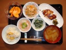 とり五目ご飯、味噌汁(白菜、椎茸)鰆の塩こうじ焼き(かぼす添え)、大学芋(黒ごま)、いんげんのピーナッツ和え、フルーツ:柿 |