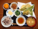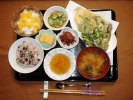赤飯、味噌汁(豆腐、なめこ、三つ葉)、天ぷら盛合せ(さつま芋、かぼちゃ、ナス、ピーマン、春菊、舞茸、竹輪いそべ揚げ)、金平ごぼう、ほうれん草とちりめんじゃこ和え、玉子焼き、フルーツ:みかん |