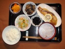 ごはん、味噌汁(かぶ、油揚げ、かぶ葉)、ぶりの照り焼き(大根おろし、カボス)、茄子油炒め煮(白いり胡麻)キャベツ・人参・根三つ葉の和え物、黒豆煮、フルーツ:柿(ふゆう) |