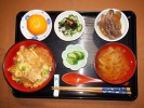 かつ丼(ロースかつ、玉ネギ、玉子、グリーンピース)、味噌汁(大根、椎茸)、牛蒡とこんにゃくの煮物、酢の物(きゅうり、ワカメ、カニカマ)、きゅうりのぬか漬け、フルーツ:和歌山みかん |