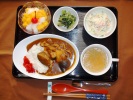 茄子ポークカレー(福神漬け)、コンソメオニオンスープ(パセコン)、スパゲティーサラダ(人参、キュウリ、ロースハム)、ほうれん草と小松菜の胡麻和え、フルーツ:杏仁マンゴープリン |