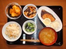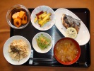 とり五目ご飯(人参、牛蒡、竹の子)、味噌汁(白菜、えのき、あげ)、ぶりの照り焼き(甘酢生姜、大根おろし、カボス添え)、芋がら煮物(人参、厚揚げ、さつま揚げ、竹輪)、キュウリ酢の物(ワカメ・キュウリ・ちりめんじゃこ)、フルーツ:柿 |