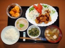 ごはん、味噌汁(豆腐、あげ、椎茸、長ネギ)、チキンカツ(グリーンリーフ、キャベツ、トマト、スパゲティサラダ)、かぶカニカマあんかけ、大根葉ふりかけ(ちりめんじゃこ、鰹節)、フルーツ:柿 |