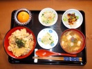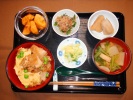 親子丼(鶏肉、玉ネギ、なると、玉子、きざみ海苔、味噌汁(豆腐、あげ、椎茸、長ネギ)、大根味噌田楽(柚子、大根葉)、キャベツ・人参・水菜のおひたし(すり胡麻がけ)、白菜漬物、フルーツ:みかん |