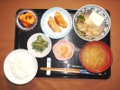 ごはん、味噌汁(大根、あげ、椎茸)、肉豆腐(豚肉、しらたき、椎茸、白菜、長ネギ)、揚げギョーザ、ほうれん草・小松菜の胡麻和え、白花豆煮、フルーツ:柿 |