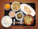 ごはん、味噌汁(長ネギ、玉子、油カレイ(カボス添え)、聖護院大根と鶏肉煮(大葉添え)、ほうれん草おひたし(おかかがけ)、白花豆煮、フルーツ:みかん |