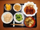 とり釜飯風ごはん、味噌汁(ワカメ、おふ、長ネギ)、ミートコロッケ(千切りキャベツ・ソース)、小松菜辛子和え、金平ごぼう(白ごまがけ)フルーツ:伊予柑 |