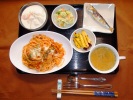 スパゲティナポリタン(ベーコン、ロースハム、玉ネギ、ピーマン、マッシュルーム)、節分めざし、コールスローサラダ(キャベツ、人参、キュウリ)、大学芋、フルーツ:ヨーグルトフルーツ(バナナ、みかん缶、白桃缶) |