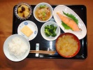 ごはん、味噌汁(白菜、しめじ)、アトランテックサーモンの塩焼き(大葉添え)、豚肉と大根煮(大根葉添え)、菜の花の辛子和え、厚焼き玉子、フルーツ:りんごコンポートレーズン煮 |