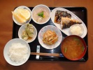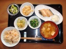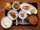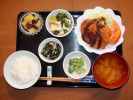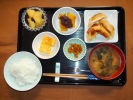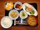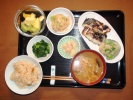 ごはん、味噌汁(茄子、しめじ、えのき、あげ)、ぶりの照り焼き(大葉添え)、ポテトサラダ(キュウリ、ロースハム、コーン、玉子)、ひじき大豆煮(人参、あげ)、ほうれん草の胡麻和え、フルーツ:伊予柑 |