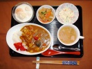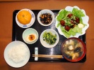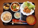 五目ご飯、味噌汁(大根、あげ)、鶏もも肉唐揚げ(サニーレタス、マヨネーズ添え)、豆腐あんかけ(人参、椎茸)、白花いんげん豆煮、フルーツ:りんごコンポート(レーズン入り) |