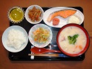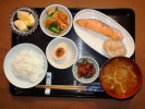 ごはん、味噌汁(白菜、えのき、あげ)、ノルウェー産塩鮭焼き(大根おろし、なめ茸和え)、大根炒め煮(人参、さつま揚げ、あげ、大根葉)、煮玉子(黒ごまがけ)、うづら豆煮、フルーツ:りんご |