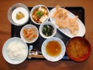 ごはん、味噌汁(ワカメ、あげ、おふ、長ネギ)、揚げギョーザ、かぼちゃいとこ煮、玉子焼き、白うり醤油漬け、フルーツ:リンゴコンポート(レーズン入) |