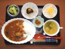 茄子ポークカレー(豚肉、玉ネギ、人参、じゃがいも、揚げ茄子、福神漬け)、コンソメスープ(レタス、ベーコン、春雨)、スパゲティサラダ(ロースハム、人参、キュウリ)、大根のきんぴら(人参、さつま揚げ、大根葉)、フルーツ:フルーツヨーグルト(バナナ、みかん缶、パイナップル) |