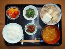 ごはん、味噌汁(玉ネギ、玉子)、肉豆腐(豆腐、豚肉、したらき、椎茸、白菜、長ネギ)、小松菜の胡麻和え、うずら豆煮、フルーツ:みかん缶、イチゴ、桃缶 |
