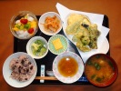 ごはん、味噌汁(大根、えのき、あげ、カイワレ)、かき揚げ(玉ネギ、干しエビ、天つゆ)、豆腐あんかけ(椎茸、しめじ、人参、万能ネギ)、レンコン・牛蒡・人参の煮物(白胡麻)、酢の物(キュウリ、ワカメ、カニカマ)、フルーツ:ヨーグルト(果物ジャム:キュウイ、リンゴ、柚子、蜂蜜) |