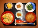 カツ丼(ロースカツ、玉ネギ、たまご、グリーンピース)、味噌汁(白菜、椎茸)、里芋甘胡麻味噌田楽(柚子添え)、ほうれん草とちりめんじゃこ和え、白うり醤油漬け、フルーツ:伊予柑 |