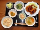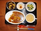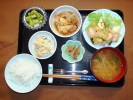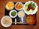あさりご飯、味噌汁(白菜、しいたけ)、ミートボール(レタス、パセリ、マヨネーズ)、大根のきんぴら(人参、さつま揚げ、大根葉)、ほうれん草とじゃこのおひたし、白花いんげん豆煮、フルーツ:杏仁豆腐(みかん缶、黄桃缶) |