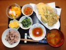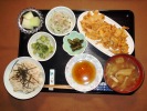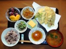 お赤飯(ごま塩)、味噌汁(豆腐、なめこ、三つ葉)、天ぷら盛合せ(さつま芋、かぼちゃ、ピーマン、ナス、アスパラ、舞茸、竹輪、ふきのとう)、金平ごぼう、酢の物(キュウリ、ワカメ、カニカマ)、厚焼き玉子、フルーツ:伊予柑、ぶとう |