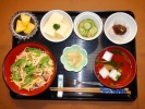 ちらし寿司(あげ、人参、椎茸、かんぴょう、桜でんぶ、とびっこ、きざみのり、白ごま、いんげん、きんしたまご)、すまし汁(はんぺん、椎茸、三つ葉)、里芋の胡麻味噌田楽(きざみ柚子)、玉子豆腐のあんかけ(三つ葉添え)、キュウリなめ茸和え、たくあんの漬物、フルーツ:生パイナップル |