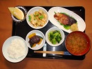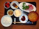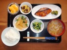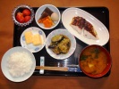 ごはん、味噌汁(豆腐、なめこ、三つ葉)、あぶらカレイの塩こうじ焼き、煮しめ(こんにゃく、さつま揚げ、里芋、花人参)、揚げ茄子のみぞれ和え、(大根おろし、万能ネギ)、厚焼きたまご、フルーツ:イチゴ |