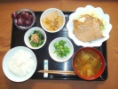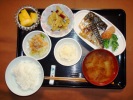 ごはん、味噌汁(白菜、椎茸、しめじ)、サバの塩焼き(ブロッコリー、胡麻和え)、大根おろし・甘酢しょうが和え、おひたし(キャベツ・人参・大根葉・おかかがけ)、大学芋、フルーツ:生パイナップル |