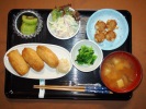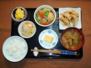 ごはん、味噌汁(白菜、椎茸)、揚げギョーザ、肉じゃが(豚肉、じゃがいも、人参、玉ネギ、しらたき、グリーンピース)、キャベツ・人参・三つ葉のおひたし、厚焼き玉子 フルーツ:生パイナップル |
