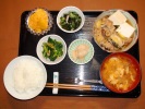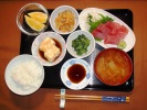ごはん、味噌汁(白菜、椎茸)、まぐろ刺身(びんちょうマグロ、大根つま、大葉、わさび)、切り干し大根煮(あげ、竹輪、さつま揚げ、人参、しいたけ)、揚げ出し豆腐、ほうれん草の胡麻和え、フルーツ:はるか |