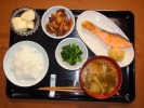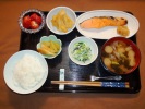 ごはん、味噌汁(白菜、えのき、あげ)、チリ産塩鮭焼き(大根おろし添え)、いもがら煮物(人参、こんにゃく、あげ、竹輪)、菜の花の辛子和え フルーツ:リンゴ |