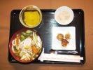 煮込みうどん(豚肉、人参、白菜、椎茸、しめじ、あげ、なると、長ネギ)、揚げシューマイ、白花いんげん豆煮、フルーツ:オレンジゼリー |