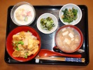 かつ丼(豚ロースかつ、玉ネギ、たまご、グリーンピース)、味噌汁(豆腐、あげ、長ネギ)、ほうれん草のなめ茸和え、酢の物(キュウリ、ワカメ、カニカマ)、フルーツ:フルーツヨーグルト(いちご、バナナ、キュウイ、黄桃缶) |