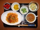 スパゲティナポリタン(玉ネギ、ピーマン、ベーコン、マッシュルーム、パセコン)、スープ(オニオンビーフブイヨン、パセコン)、かぼちゃサラダ(レーズン入り)、コールスローサラダ(キャベツ、人参、キュウリ)、ブロッコリーの胡麻ドレ和え、フルーツ:イチゴ(練乳がけ) |